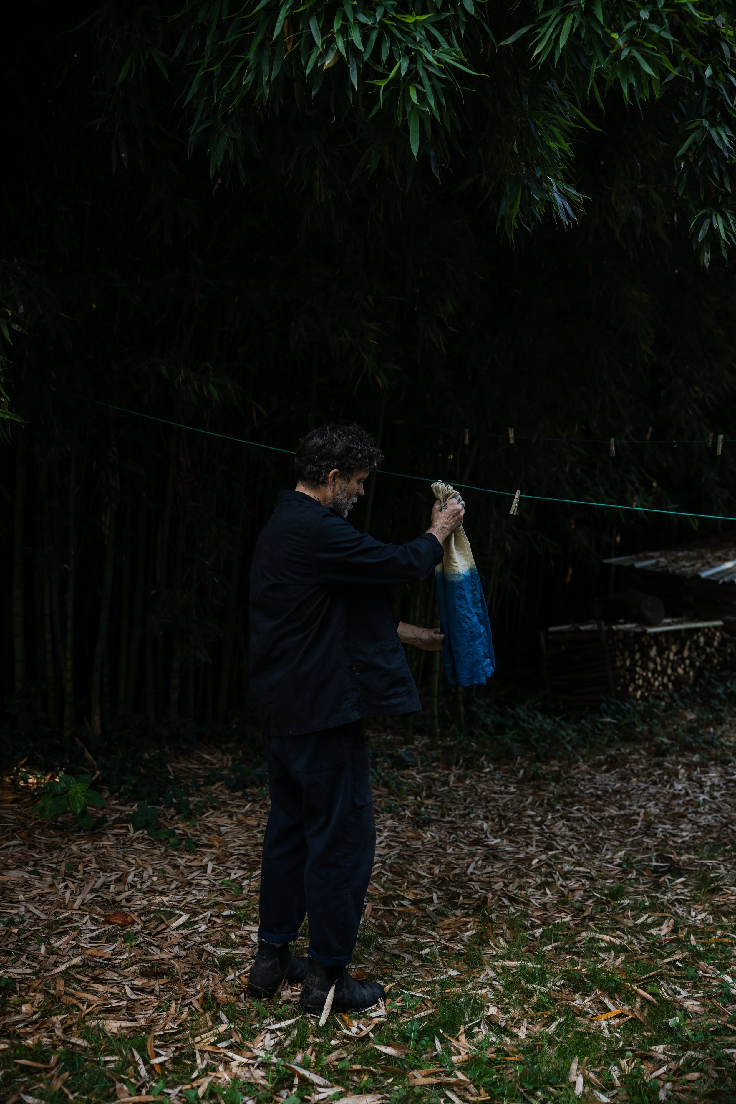Joël Dagès est artiste teinturier. Ses teintures sont conçues comme des tableaux. Déposées sur la toile, grâce à des passages successifs dans les bains de teinture, les couleurs se fixent et se mélangent pour créer des mouvements vibratoires. Les pigments utilisés sont tous végétaux et écologiques, les techniques de teinture ancestrales et les tissus récupérés de seconde main.